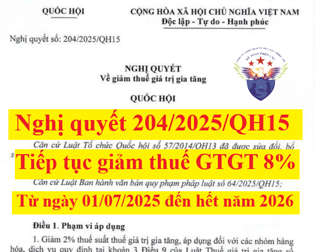 Ngày 17/6/2025, Quốc hội đã thông qua Nghị quyết 204/2025/QH15 về việc tiếp tục giảm thuế GTGT từ 10% xuống 8% từ ngày 01/7/2025 đến hết năm 2026